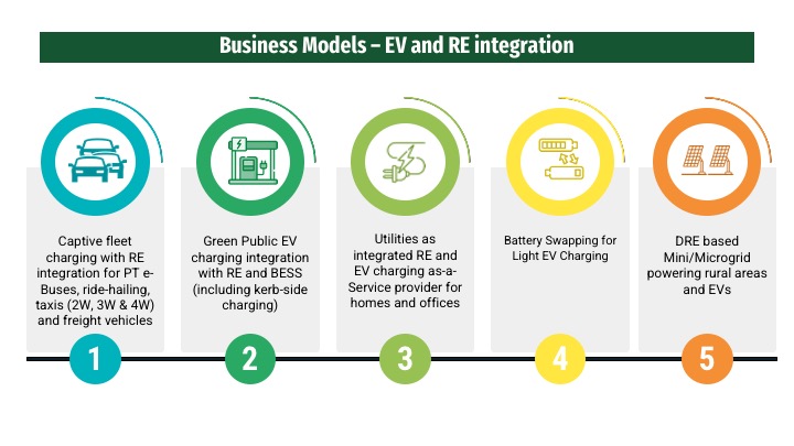 This section outlines opportunities at the intersection of both technologies, and presents various EV charging business models integrating RE. The business models (as shown below), look into different energy models, charging models, vehicle segments and applications.